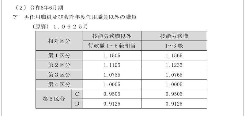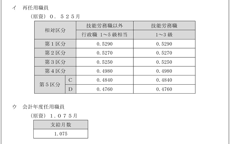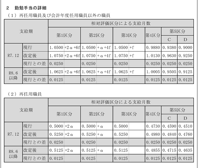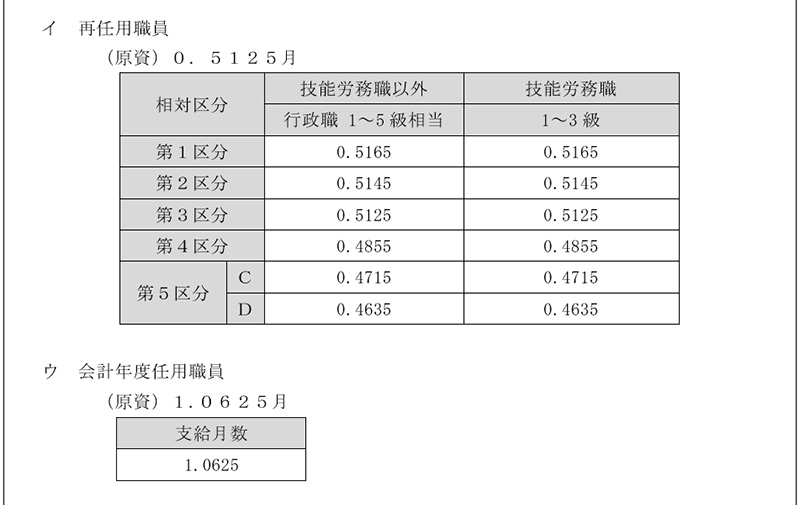 再任用職員については、年間で0.05月分引き上げて2.45月分に改定し、本年度については、12月期の期末手当及び勤勉手当をそれぞれ0.025月分引き上げ、来年度以降は、6月期及び12月期の期末手当及び勤勉手当をそれぞれ0.0125月分ずつ均等に引き上げることとする。