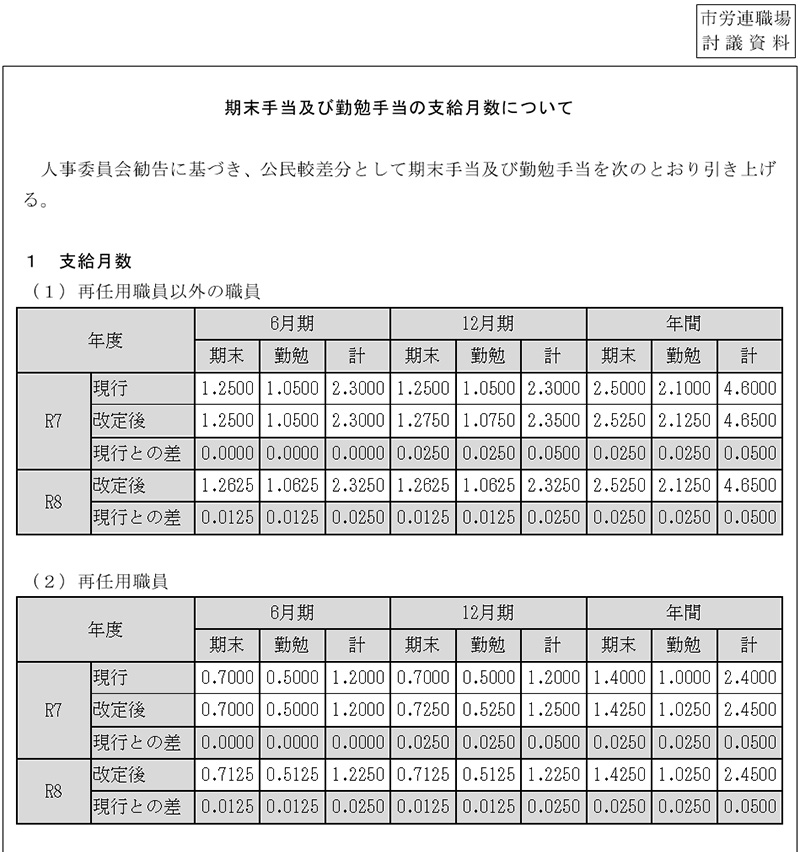 団体交渉で市側は、月例給の公民較差(12,653円、3.10%)を解消するため、人事委員会勧告どおり引き上げ、2025年4月1日に遡って実施するとした。各給料表の引き上げ額については、行政職給料表では大学卒初任給を12,000円、高校卒初任給を12,300円引き上げ、30歳台後半までに重点を置きつつ、40歳台以上は定率を基本として改定を行うこととし、その他の給料表についても行政職給料表と同様の考え方が示された。再任用職員については、国の改定傾向を参考に、最高号給の改定額を基本に改定するとした考え方を示しました。また、会計年度任用職員についても、正規職員と同様に2025年4月に遡及して実施するとの考え方が示された。一時金については、本年度12月期から0.05月分引き上げ、年間の支給月数を4.65月とし、引き上げ分については、期末手当及び勤勉手当に均等に配分するとの回答を行った。