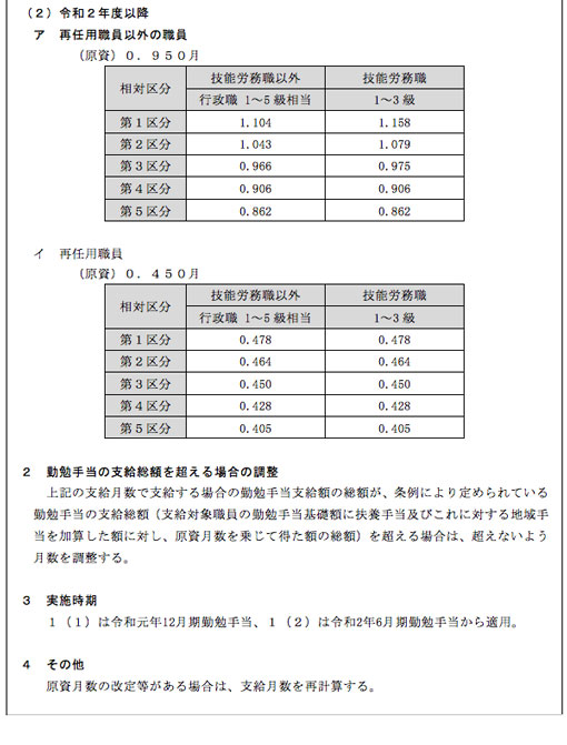 なお、期末・勤勉手当の配分は以上のとおりであるが、具体の勤勉手当については、別紙のとおり予め算定した月数を基本とする。ただし、条例に定められている支給総額を超えないよう調整する場合があることにご留意いただきたい。