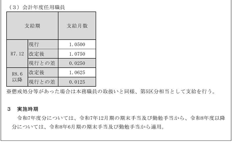 再任用職員については、年間で0.05月分引き上げて2.45月分に改定し、本年度については、12月期の期末手当及び勤勉手当をそれぞれ0.025月分引き上げ、来年度以降は、6月期及び12月期の期末手当及び勤勉手当をそれぞれ0.0125月分ずつ均等に引き上げることとする。