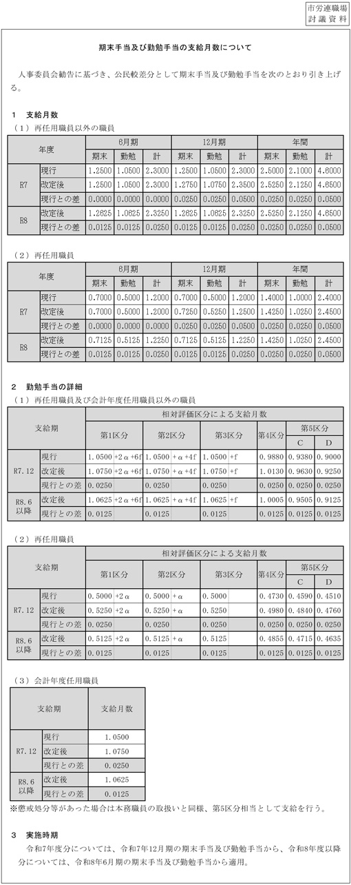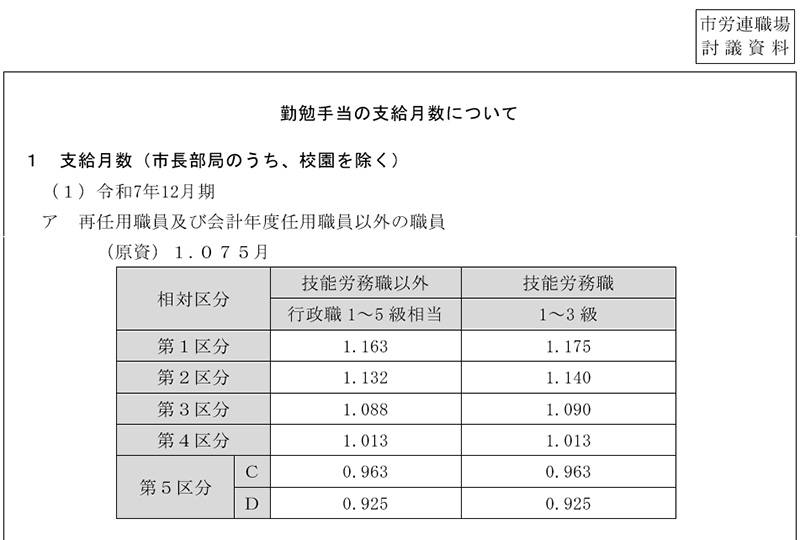 また、年末手当の支給については、各単組からの申し入れを受けた後、市労連との統一交渉として取り扱ってきたところである。この間の協議内容を踏まえ、詳細の回答をさせていただく。