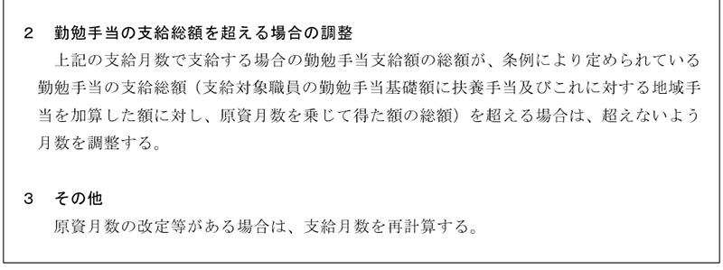 なお、期末・勤勉手当の配分は以上のとおりであるが、具体の勤勉手当については、別紙のとおり予め算定した月数を基本とする。ただし、条例に定められている支給総額を超えないよう調整する場合があることにご留意いただきたい。